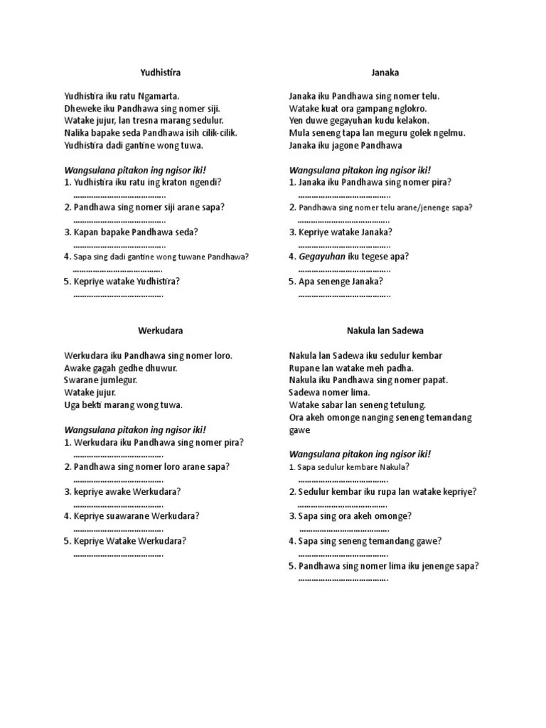Sedhih kingkin kaworan nglokro, kanggo medharake rasa gegetun . Makaryo ya makaryo, nanging sabisané. 1) guru tegese paugeran, wewaton, pathokan sing dianut. Kadang pandhawa pepes atine nampa kabar sedane gathutkaca. 10 megatruh saka tembung megat + sedhih lan rasa nglokro kanggo nelakake rasa ruh tegese mati .